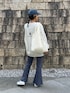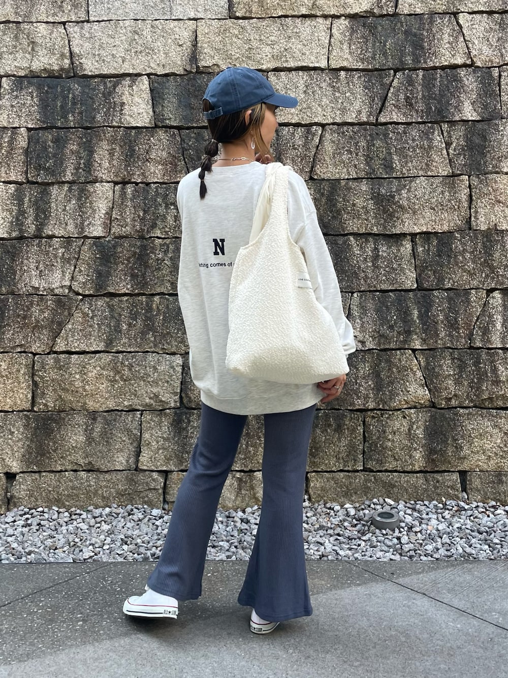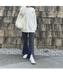 くすみブルーが可愛いセンタースリット入りワッフルフレアパンツ♡ 楽な着心地でシルエットもきれい✨ オーバーサイズのロゴスウェットと合わせた楽ちんカジュアルスタイル😊 ▪️Instagram COPINE→@copine_ayaiku 私→@ayayayark