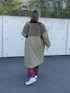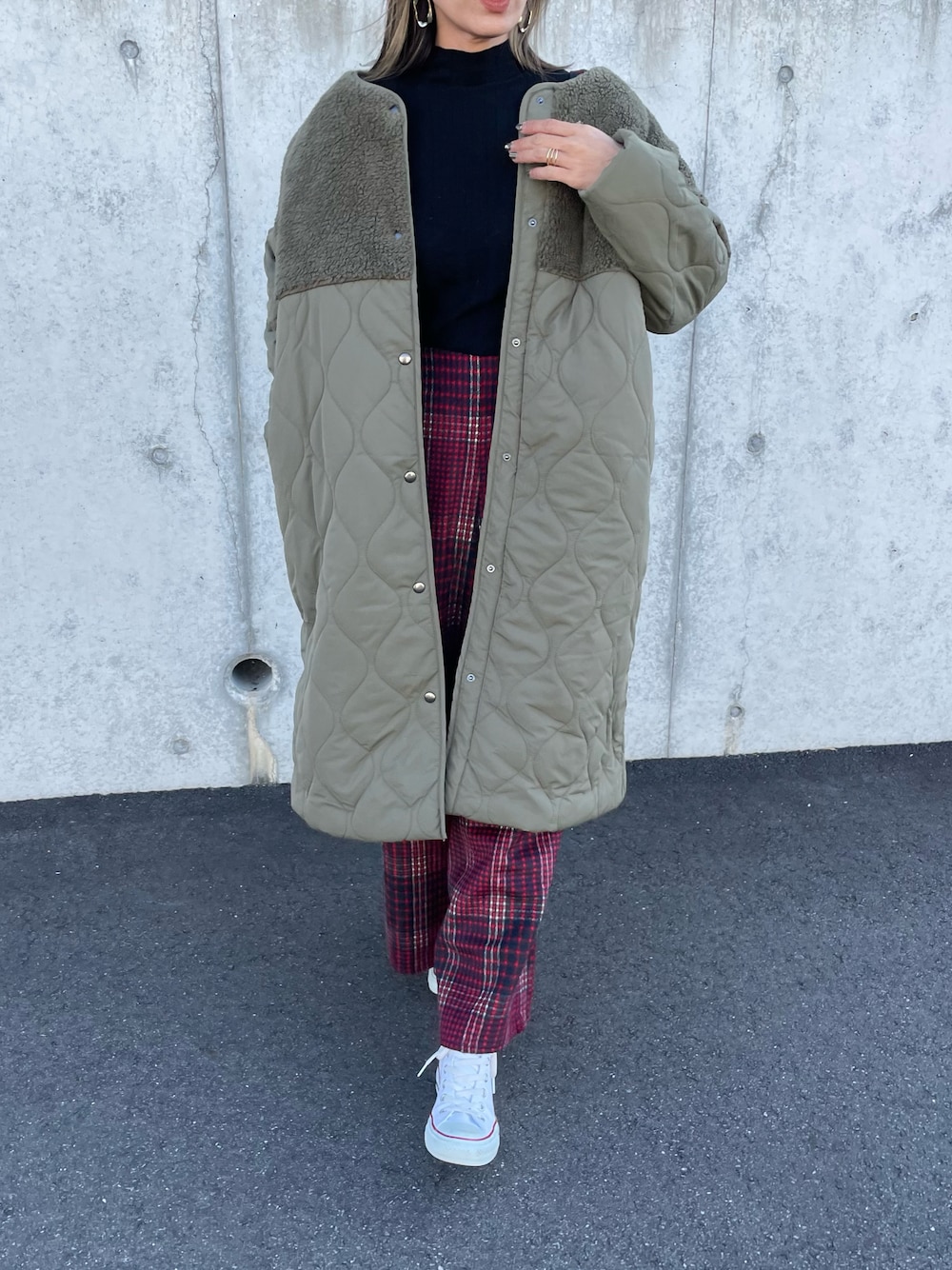 ayaのノーカラージャケット「ボア×キルティング切り替えロングコート(カーキ)」を使ったコーディネート
