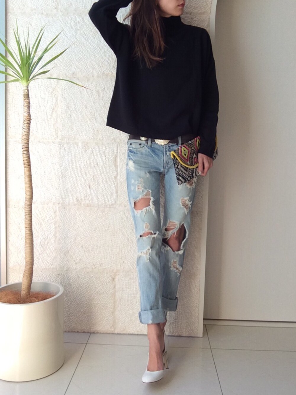 休日コーデ❤︎ 今日はとってもいいお天気なので、クラッシュがはげしいデニムを久々に履きました♪ トップスはシンプルにブラックタートルニット〜 ピアスとバッグの小物であそびました❤︎ いい休日を〜❤︎