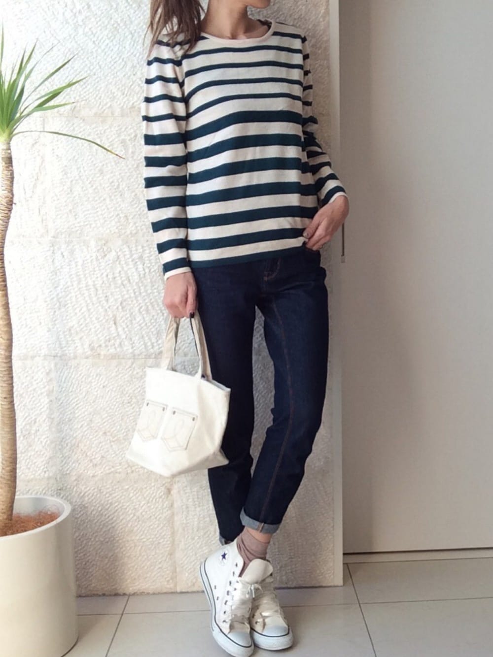 今日はお天気がよくて、気持ちよかったぁ〜❤︎ そんな休日コーデは、、、 『さわやかカジュアルコーデ❤︎』 あくまでも、自分の中でさわやかと思っているだけですが。笑 もうすぐ入荷する新商品を早く着たくて、さっそく着ちゃいました❤︎ アイボリーとグリーンのボーダーが可愛いニットに、ヘビロテ中のGUのボトムを合わせ、全体的にホワイトメインでさわやかカジュアルに❤︎ デニム風なコーデュロイミニトートでさわやかさUP♪自分の中で。笑 このトート、デニムのヒップを思わせるようなデザインでお気に入り❤︎ 見えませんが、ポニーテールで娘のスタッズがついたリボンゴムで珍しく可愛さもプラスしてみました。笑 copine http://www.copinecopine.com