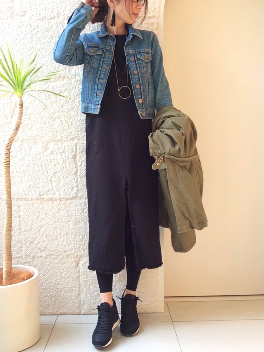 ご覧くださりありがとうございます❤︎ いいね♡、セーブ、フォローなどもありがとうございます♥️ 嬉しいでっす💕 昨日のコーデです😍 珍しくノースリのデニムワンピを着てみました😁笑 これワンピで合ってるのかな?w こーゆーのなんていうんだろw わからないw 前にスリット入ってて、切りっぱみたいになってて、かなり安くて即ゲットしたものです❤︎w 本当は素足のが可愛いはずなんですが、寒さには勝てないのでレギンス履いちゃいました😂笑 デニジャケの上に更にジャケを羽織り、初のアウターオンアウター‼️ アウアウです😁笑←miiちゃんw 昨日は相棒いくや、他ママ友とランチ❤︎ ひたすら食べ、しゃべりw タノシカッタ💕 アウターありは、肩掛けして撮ったら手が見えなくて変になっちゃった。笑 でも載せちゃうw そんな感じでちょいと春を意識したコーデでした💕