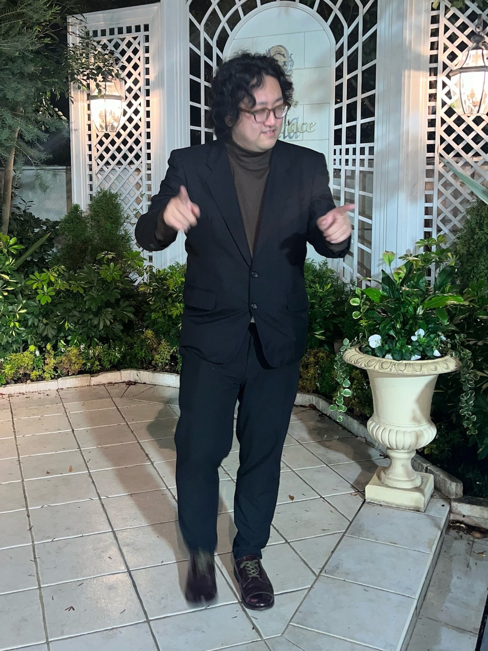 最近開いてないから連投。 ちょい前の式場でのパーティ いい機会だったから何年も前に買ったコムデギャルソンオムのテーラード、たぶん初めて着た 全体的に黒×茶でシンプルすっきりかっちり