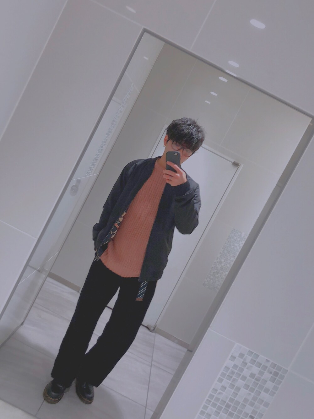 ピンク系のニット/セーター、ブラック系のブーツを着用したメンズの春コーディネートの1枚目の写真
