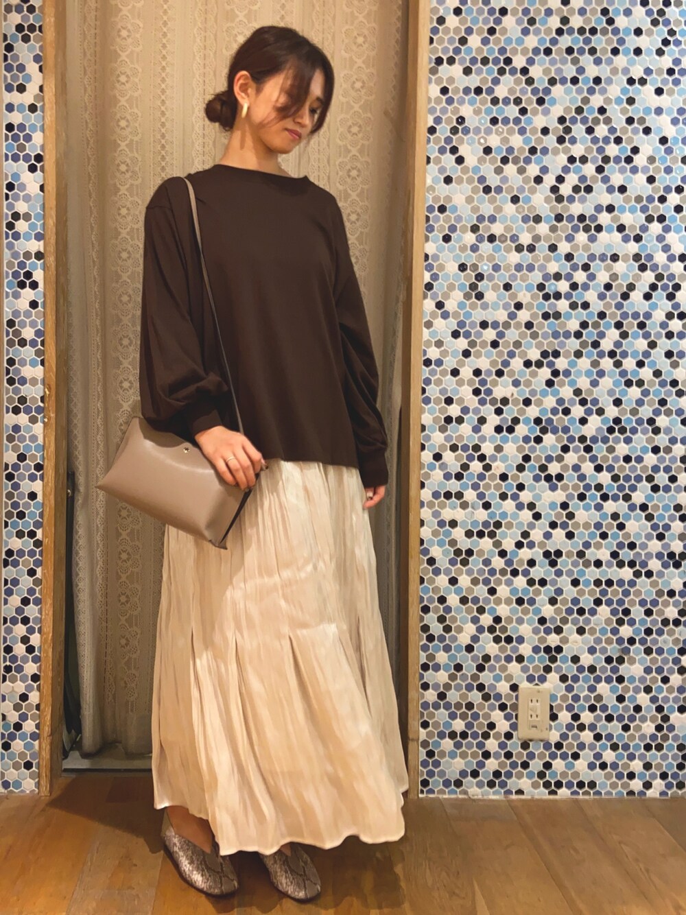 シンプルコーデ🤍 歩くたびに裾の動きがとてもかわいいスカートです!✨サテン生地なので高級感あります! 大人気のふわ袖チュニックはブラウンで秋っぽく🍁
