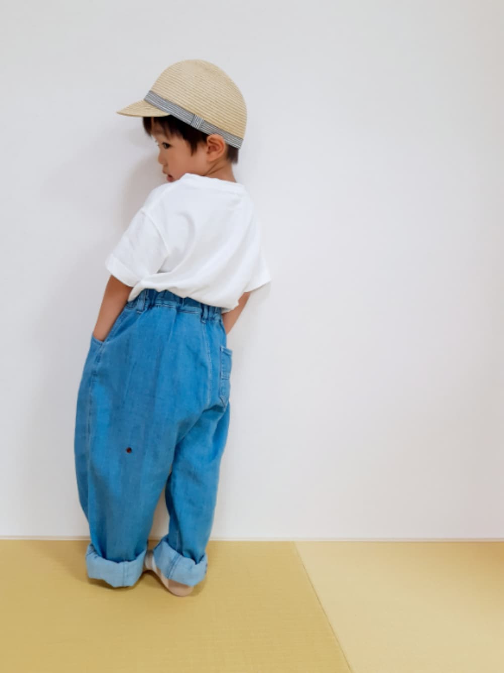 寝ぼけてたのか、間違えて120のパンツを買ってしまったので致し方なく履いてもらってます💧 膝裏辺りにてんとう虫🐞