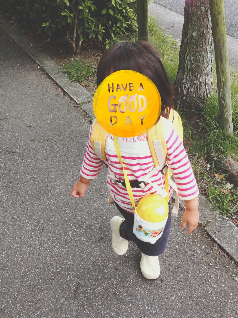 長女さんの幼稚園スタイル。 アンパンマンの水筒さげて かっこつけてます。笑