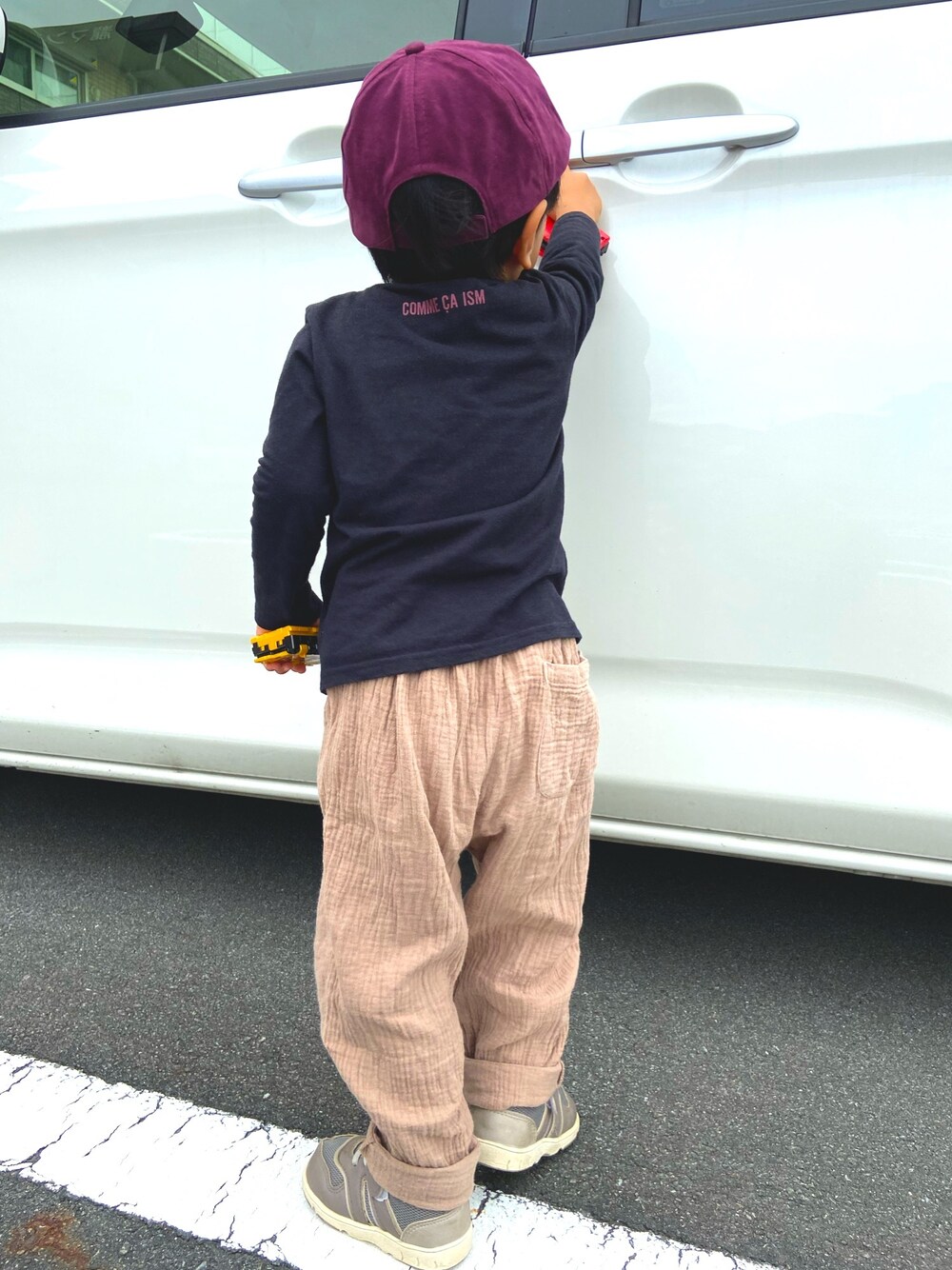 こんにちは🍠 目にとめて頂きありがとうございます✨ 昨日はDAISOの小豆色キャップをかぶりたくて ロンTのロゴの色と合わせてみました~👌🏻 小豆というか、サツマイモというか…😌 秋っぽいカラーが好きです♡ すべてプチプラ😜 ロンTはおさがり♡ これからどんどん秋らしいお洋服着せたいなぁ…🍂🌰🍁
