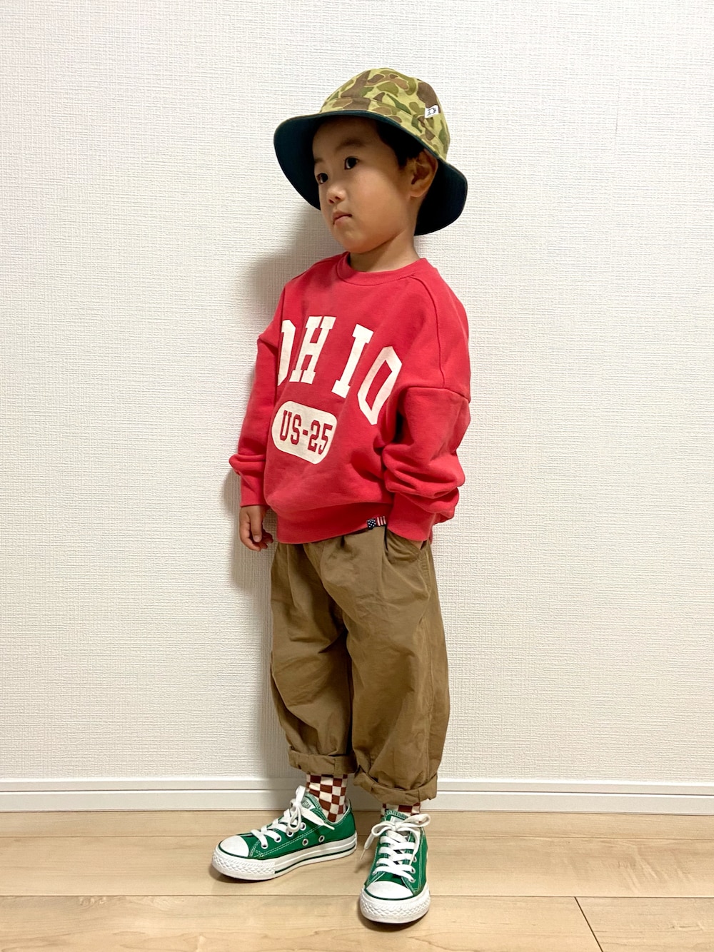 こんにちは☕️ 今日も見ていただき ありがとうございます♡*° 昨日伊東のじぃじばぁばの所へ 遊びに行ってきました😊 外行くとなると スニーカーはikkiがシルバー好きで そればかりだし、 じぃじ🏡の前で撮っても🧦見えなかったので 帰ってきてから帽子も靴も変えて 撮り直しました😅 毎度のことシワシワですみません🙏🏻w 小物の柄でちょっと遊んでみました🦆❤🏁 このスウェット、、 やっと出したかと思った方もいたことでしょう…!爆 8/13に載せてたわ…w 飛びついて買って小窓で紹介した割に 寝かしまくりのやつです😇 でもやっぱりかわいい❤️ 小窓🪟は 一輪車に乗せてもらった所 笑顔だけどびびってすぐ降りる!💦と😂 母も昔乗ったな… 父も母も実家は田舎🌾