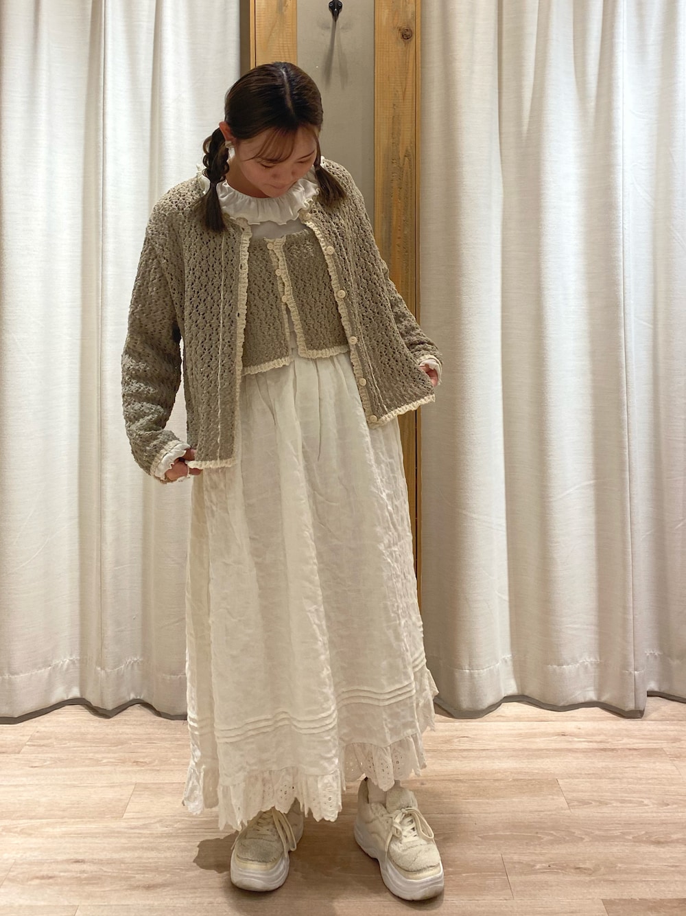ことことのカーディガン/ボレロ「透かし配色トリミングカーディガン」を使ったコーディネート