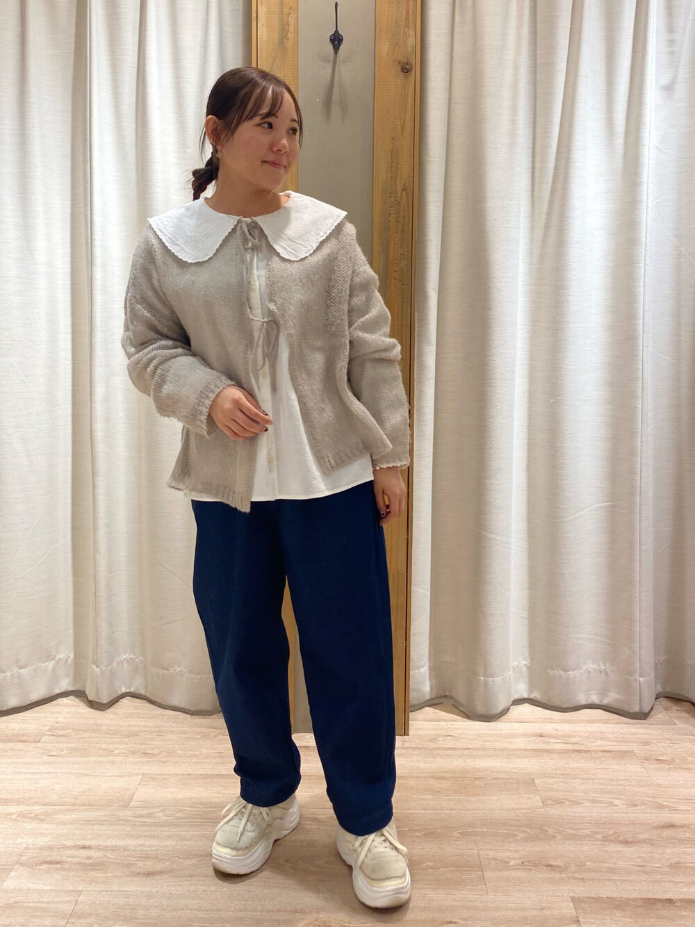 \ ガーリー&カジュアル / 透け感のあるニットカーディガンは、春コーデに大活躍間違いなしです! パンツは、サマンサのデニムパンツで、Mサイズを着用していますが、お尻や太もも周りがゆったりしていて、履き心地◎です( ¨̮ )