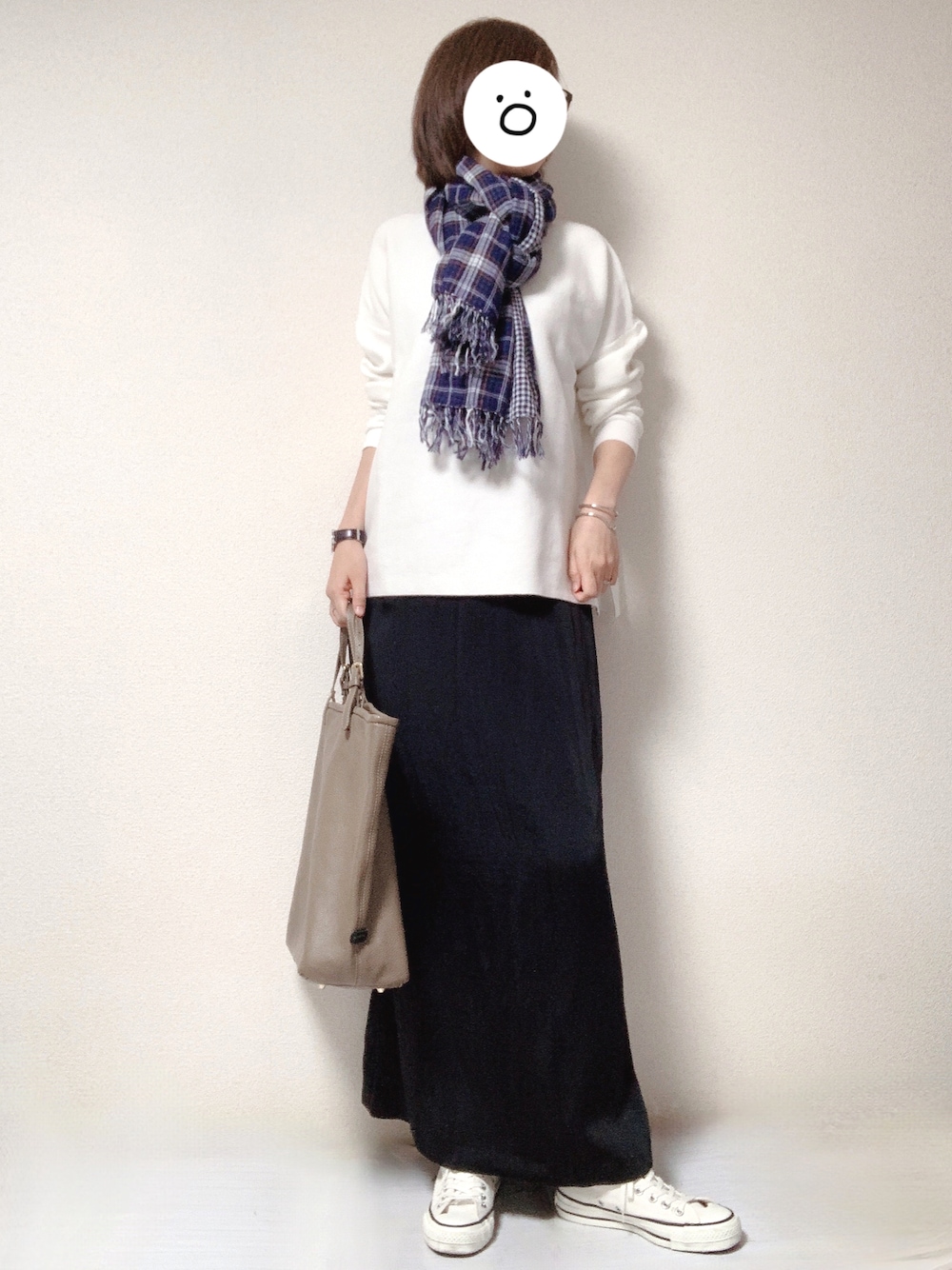 最高気温24度、最低気温気温14度、晴れ 昨日の出勤コーデです。 先日着心地の良さに惚れて購入した綺麗な白のコットンニットと、昨年購入した黒のサテンのロングスカートを合わせ、防寒用に無印で結構前に購入した紺チェックのガーゼストールを合わせました。 このネイビーのチェック柄のガーゼストール、結構前に3900円くらいで購入したのですが、服がモノトーンの時の差し小物としてかなりお役立ちなので気に入っております。
