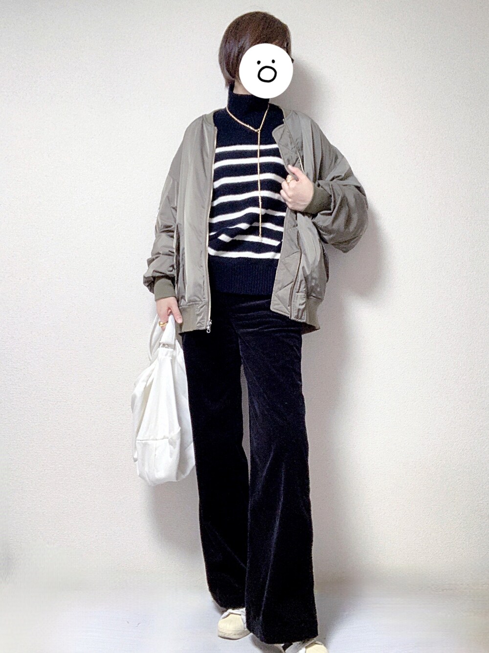 最高気温14度、最低気温5度、晴れ 昨日の在宅コーデです。 ユニクロのお気に入りのスフレヤーンボーダーニットに、同じくユニクロCのコーデュロイパンツであったかリラックスコーデでした。 昼間に少し外出した際は今期初着用となるMAー1で防寒対策をしました。 最近MAー1の人気が下火になっておりますが、メンズっぽく着ることが出来るアイテムなので個人的には大好きなアイテムです。