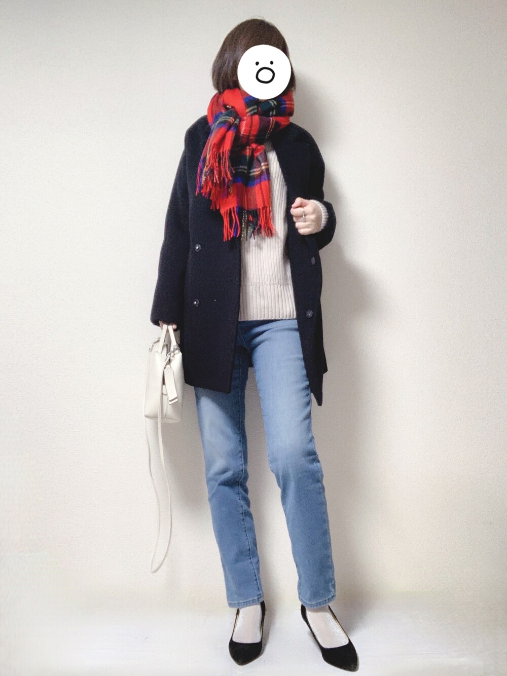 最高気温8度、最低気温2度、晴れ 昨日の外出コーデです。 あまりにも寒かったので、遂にGUで以前購入していた裏起毛のあったかデニムと厚手ニットと今年購入したウールコート、そしてお気に入りのジョンストンズの赤チェックストールを持ち込みました。 足元はラメ靴下×パンプスでした。
