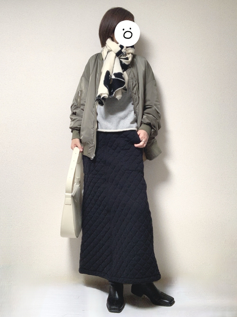 最高気温10度、最低気温-1度、晴れ 昨日の在宅ワーク&外出時のコーデです。 スウェットトップスにキルティングの厚地ロングスカートの、ワンマイルスタイルな感じでした。