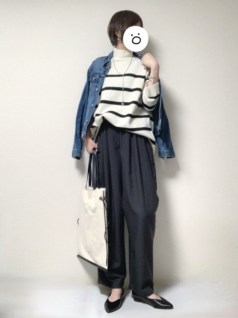 最高気温10度、最低気温5度、晴れのち曇 昨日の出勤コーデです。 朝方の冷え込みが多少ゆるみ始めてきたものの、最高気温がまだまだ上がらない感じなので、ワイドパンツの中には裏起毛のペチコート、まだまだ現役ハイネックワイド系のニットを着用しました。 当初そろそろGジャン着たいなぁと思ってこんな感じの春コーデを考えておりましたが…寒くて更にこの上にロングのキルティングコート羽織っておりました。 そろそろスプリングコートが着たいなぁと思う今日この頃。