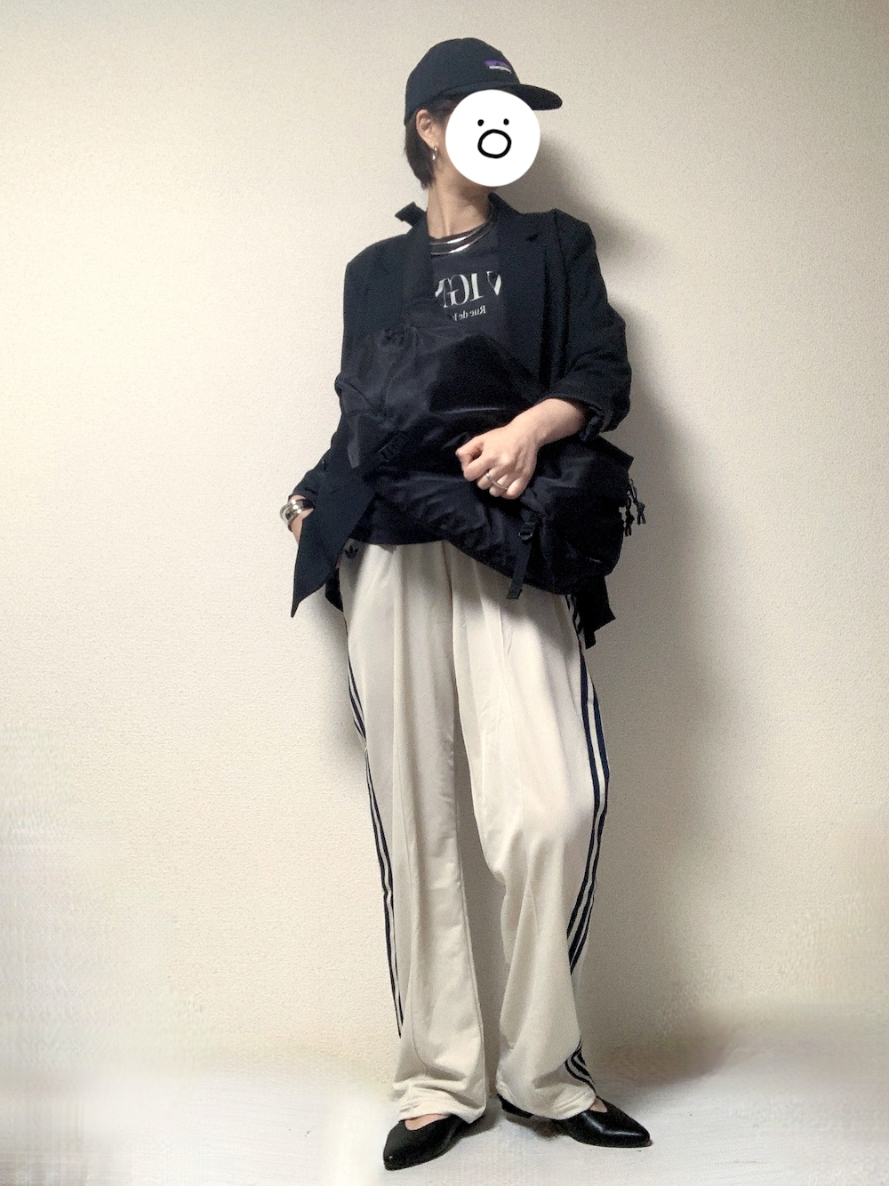 最高気温17度、最低気温4度、晴れ 削除の買い出し時の格好です。 先日のルミネのセールで一目惚れしたベージュのトラックパンツを早速着用しました。 「GU×beautiful people」のコラボ時のトラックパンツには特単惹かれるようなことはなかったのですが、このトラックパンツは綺麗めのテロテロ系ワイドパンツみたいに履けそう!と、色々コーデが浮かんだので購入に至りました。 adidasなのでトレーニングウェアとしても使えそうです。