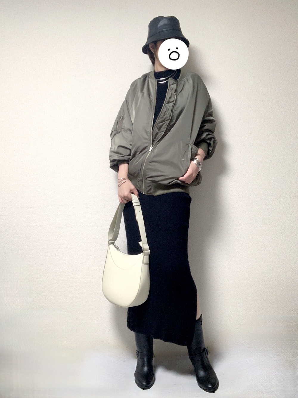 最高気温13度、最低気温11度、曇りのち雨 昨日の外出時のコーデです。 夕方の外出だったため、こんな感じて足元は雨に濡れても良いレインブーツ、バッグはユニクロの合皮のショルダーバッグにしました。 日中殆ど気温は変わりませんでしたが、10度台前半は寒いので、中はヒートテック、そして薄手のニットセットアップを着ておりました。