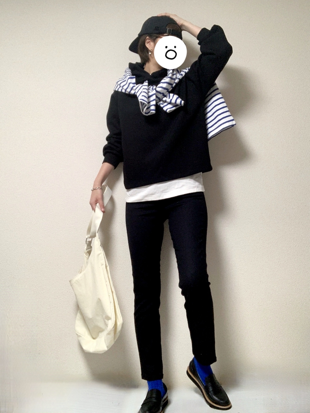 最高気温21度、最低気温11度、雨のち晴れ 昨日の在宅ワーク&外出時の格好です。 午前中は寒かったのでTシャツの上にパーカーを重ねて暖かくしておりました。 午後には雨風も止んで晴れましたが、小雨の降る時間帯だったので濡れないように黒ベースにし、靴下にだけカラーを差し込んでみました。