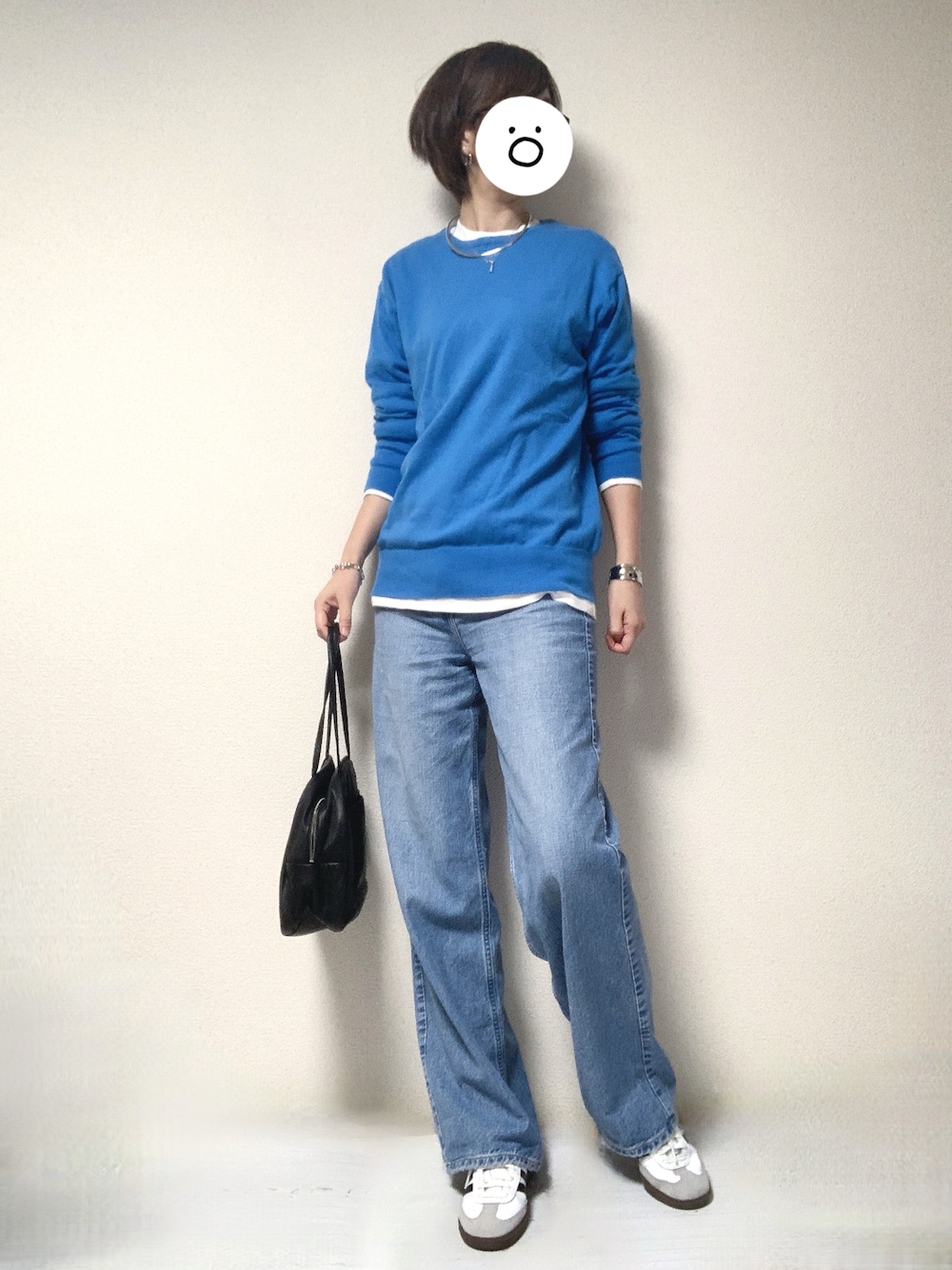 最高気温23度、最低気温11度、晴れ 昨日の外出コーデです。 複数のスーパーをハシゴ予定だったので、基本的に足が疲れないスニーカーにしました。 久々にスカイブルーのニットを着ましたが、パキッとした色はテンション上がりますね。