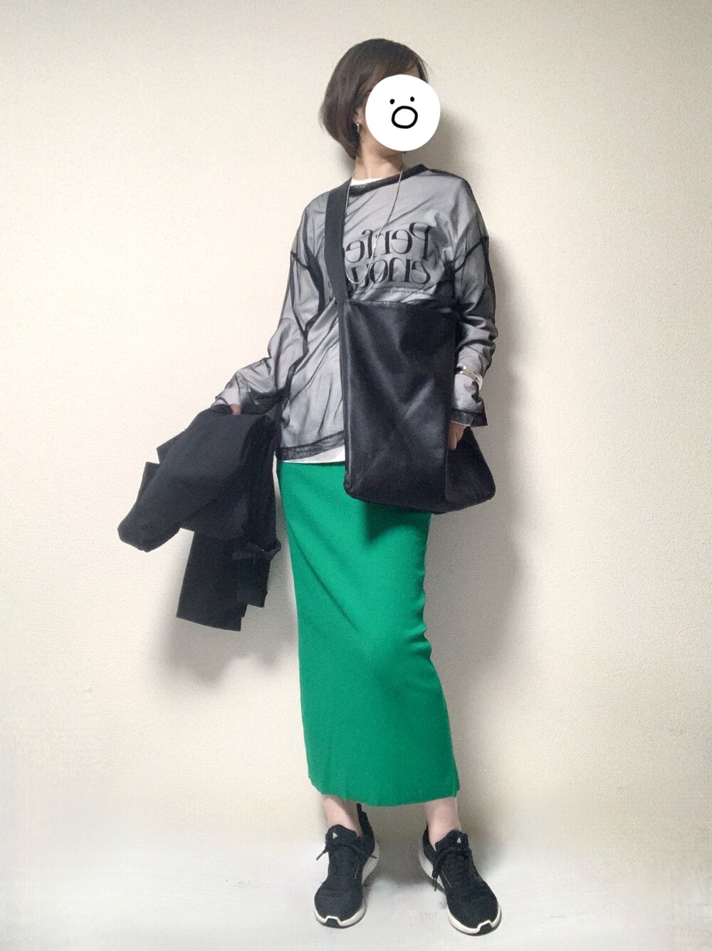 今週どこかの出勤時の格好です。 ゴールデンウィーク明けから毎日出社が義務付け&激務になってしまったため、いつもに増して格好がカジュアルになっております。 この日も残業がハードになりそうだったため、Tシャツの上にオーバーサイズのシアーTを重ね、さらにボトムは伸縮性の高いプチプラのスカートにしました。 緑のスカートは目立ち過ぎるかと思いましたが、このくらい明るい色を身に付けて気分を上げないと最近辛いです…。