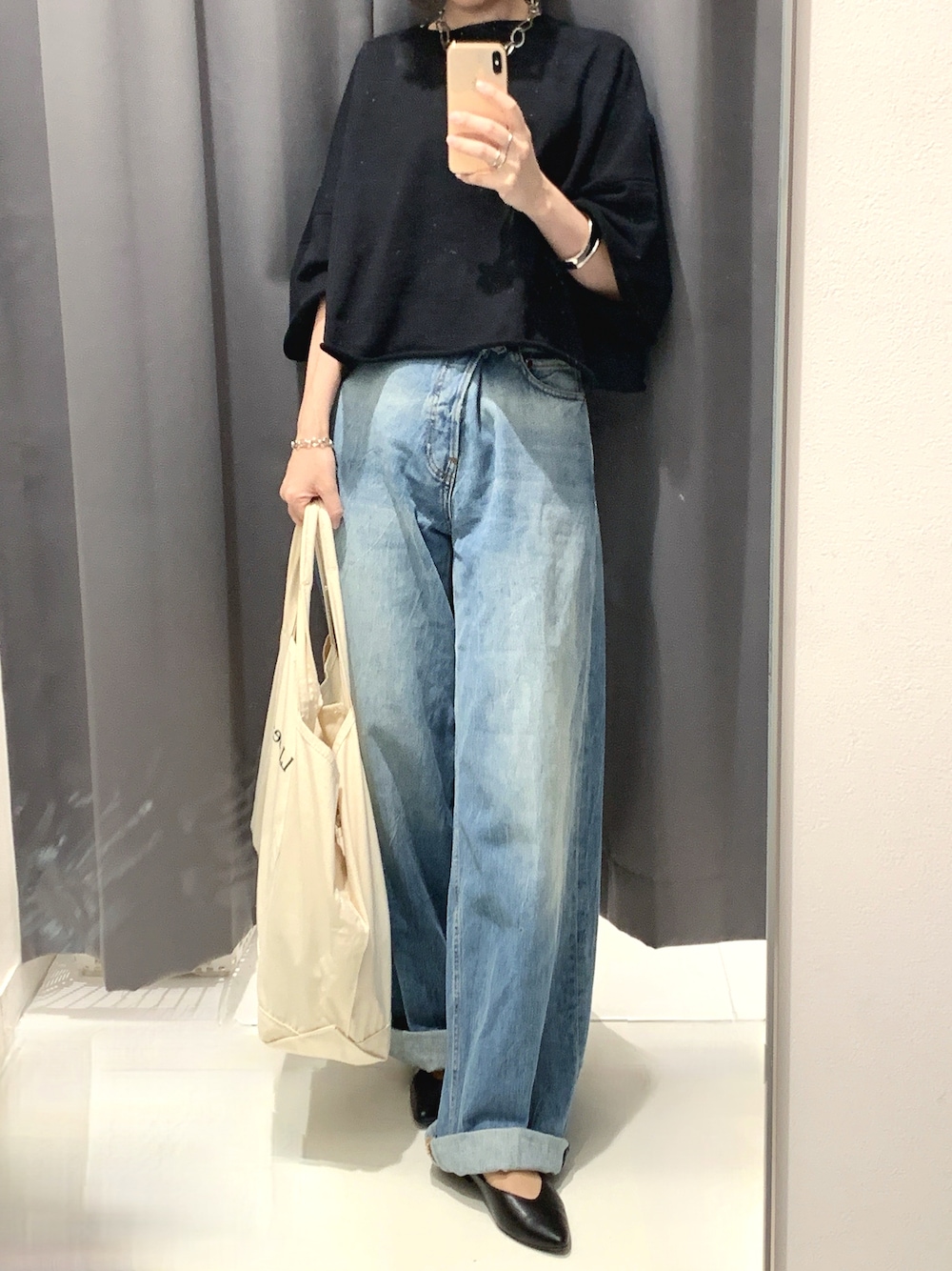 最高気温23度、最低気温18度、晴れ時々大雨 昨日の外出コーデです。 お気に入りの「FRAMeWORK」のショート丈トップスに、「HAIKURE」の超ダボデニムを合わせたコーデでした。 これに「L.L.Bean」のバッグを合わせた超カジュアル&ラフな感じが好きです。