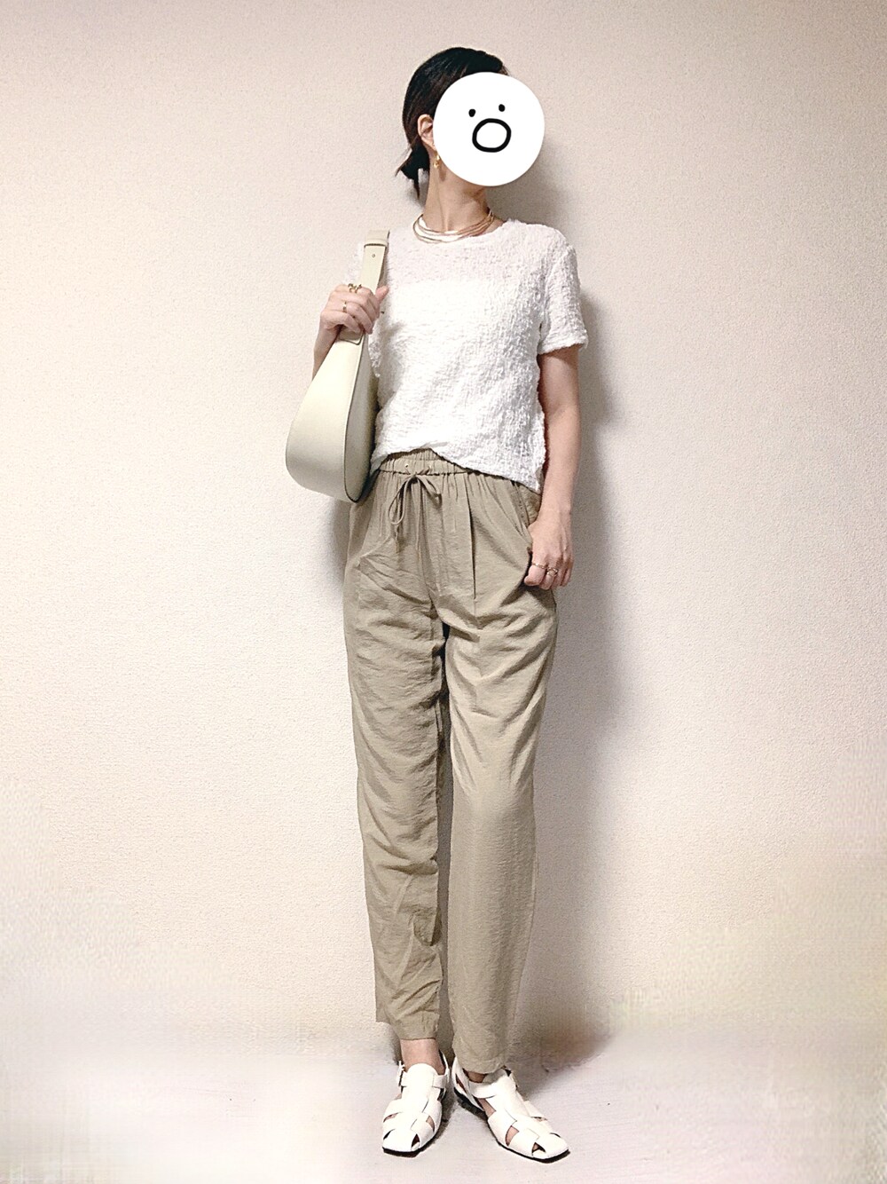 最高気温34度、最低気温27度、曇り 昨日の通勤コーデです。 今年、自分の中でシャーリング系のトップスやボトムが気になり、ついユニクロでお安くなってたこちらのシャーリングTを購入してしまったのですが…特にトップスでこういうパキ白は本当に合わせにくいです…。 しかもピタピタだと若作り感が凄くなるのでワンサイズ上げたのですが…腕の長さがもう少し欲しかった…。 購入したからにはしっかり使うというのが基本的なスタンスなのですが、このTに関しては今年の夏が終わったら完全ご近所着になってしまいそうです…。