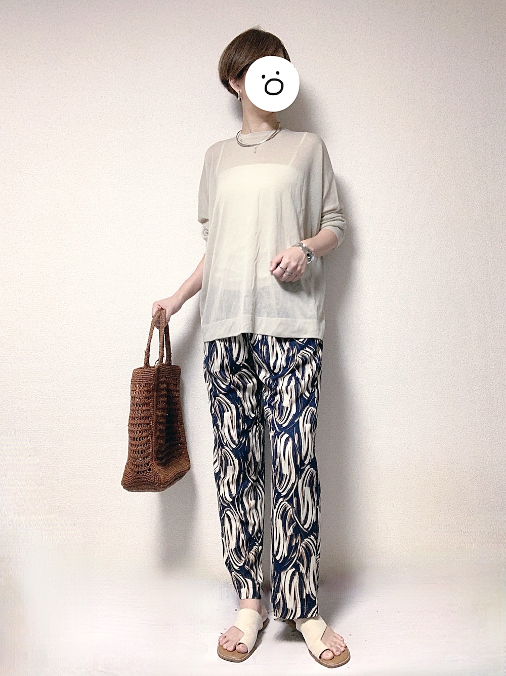 最高気温33度、最低気温24度、雨のち晴れ 昨日の今日コーデです。 終日のんびりと出来る日だったので、ご近所の買い物時の時だけ、こんな感じの格好でした。 昨日は少し涼しめだったので薄手のシアー2WAYカーディガンと、秋色のゆるっと柄パンツを合わせ、リラックススタイルでした。