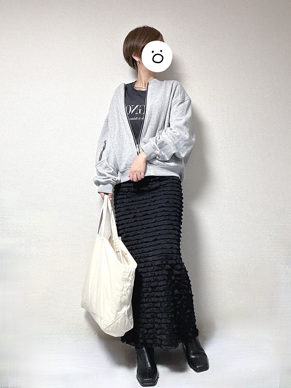 最高気温20度、最低気温13度、雨のち曇り 昨日の通勤時の格好です。 昨年購入したスウェット素材のZARAのブルゾンに、初秋に購入した黒のゆったりめの黒のIラインのちょいフリルスカートを着用しました。 週末最後は遅くまで頑張れるように、楽な格好をしている事が多いです。