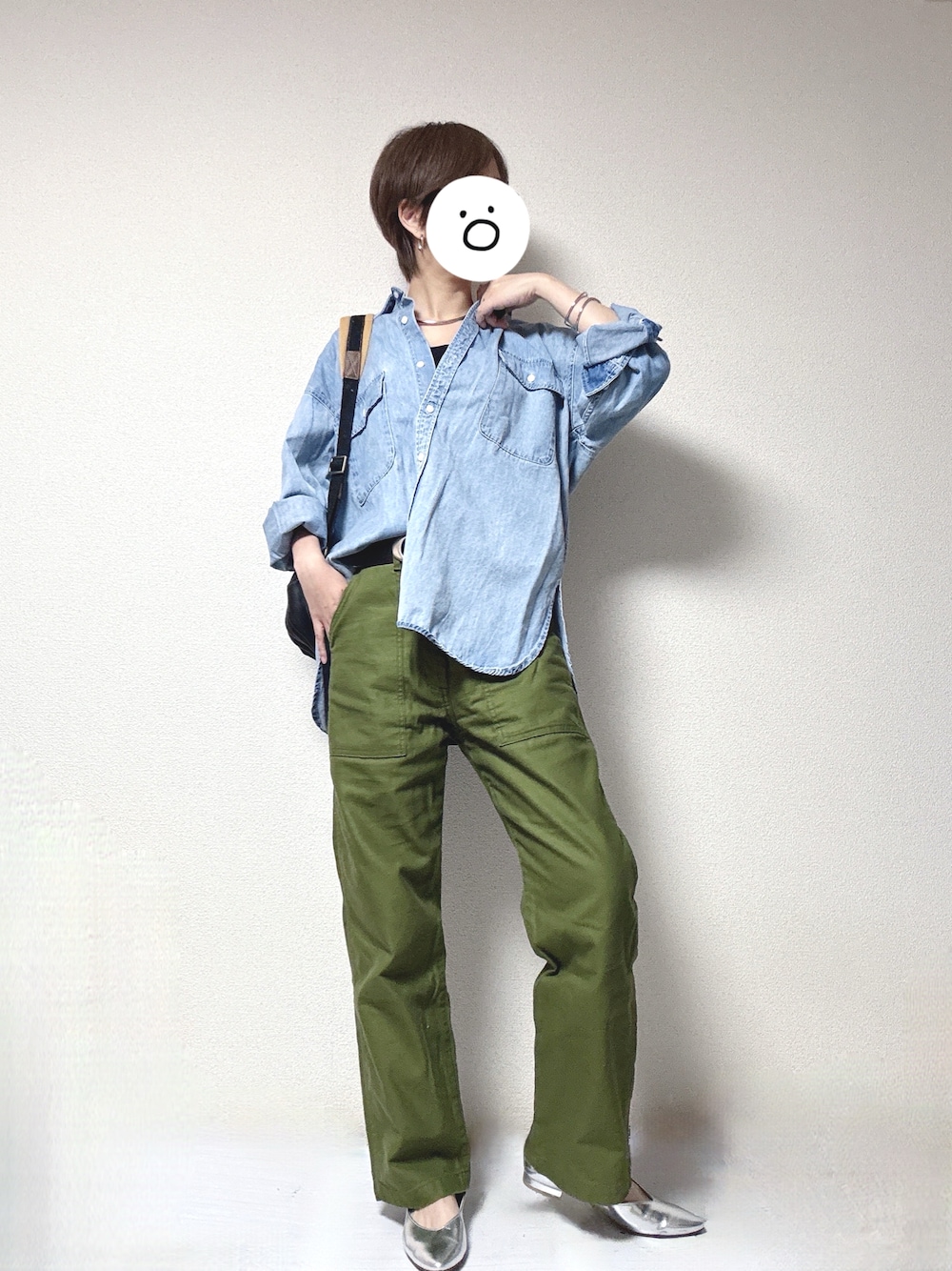 最高気温22度、最低気温10度、晴れ 昨日の通勤コーデです。 朝晩は少し冷え込みが強かったのですが、日中はこんな感じの格好でも過ごせました。 デニムライクのダンガリーシャツにカーキのベイカーパンツ、そこに去年から豊富に取り揃えられているシルバーのパンプスを合わせました。 そして…久々にリュックを背負って会社に行きましたが、ほんと楽だわ…。