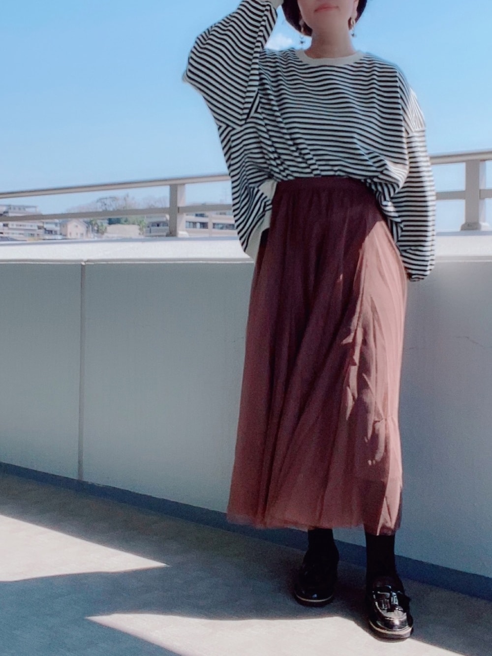 ゆづきのTシャツ/カットソー「ゆったりルーズオーバーシルエットコットンブレンドバルーンスリーブ後ろ長めボーダープルオーバー」を使ったコーディネート