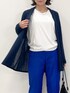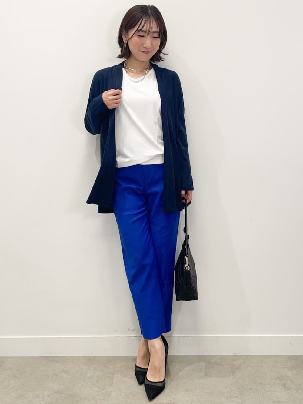 袖口の辺りはスッキリとアームには適度なゆとりを持たせて楽な着心地のカーディガンです。 程よい透け感もあり、接触冷感とUVケアで機能性も◎ 夏の日差し避けにもおすすめです♪ なんと言っても嬉しいのはお尻にかかる着丈! スリムパンツの時でも安心になっています。 落ち感のある素材で広がりすぎないので合わせるアイテムを選ばず着用できるので、毎日着たい1着です♪ 今回は爽やかなカラーでまとめてみました。