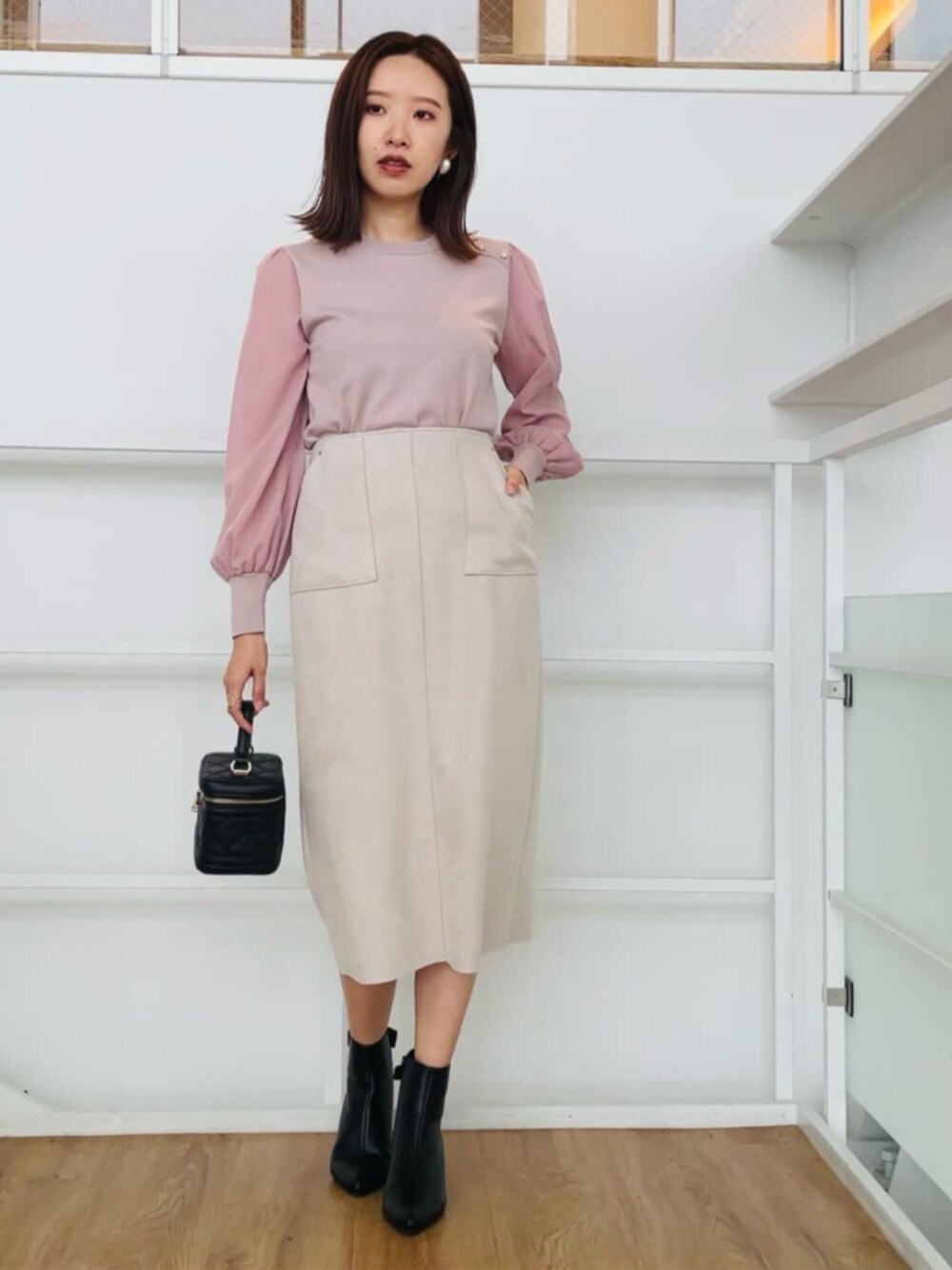 身長162cm Staffコーデのご紹介です♪ 【サイズ感】 Mサイズでちょうどよく着られました。 【スタイリングポイント】 ピンクニットの肩の飾りボタンとふんわりした袖が女性らしさを引き立てています♪ タイトスカートと合わせて通勤コーデを完成!