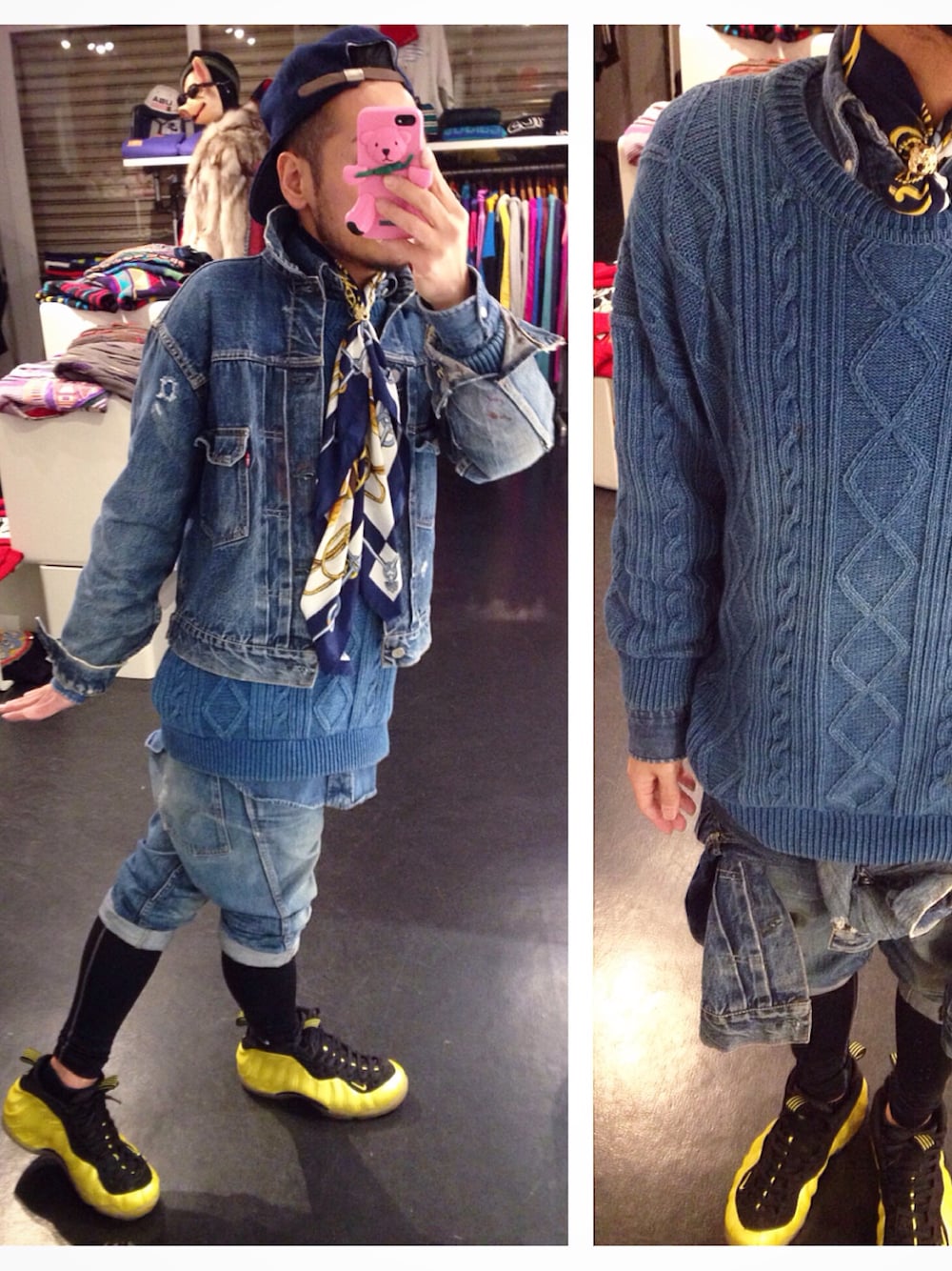 インディゴ x イエロー。 ヴィンテージデニムセットアップの深い藍色にピッカピカスニーカー。 差し色。いや、刺し色。刺しすぎ色。