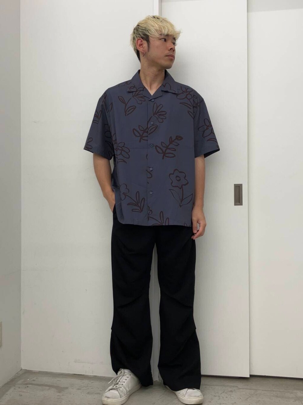 こんにちは!今回は新作のブラックモチーフフラワーショートスリーブシャツを使ってコーディネートを組んでみました! 入荷時から大人気のシャツは、オープンカラーになっていて涼しげなデザイン! 暗めのカラーバリエーションですが、花柄が入っていて重くなりすぎないのもGood! フレアパンツと合わせて古着感を出して着たり、カーゴパンツで今っぽく合わせるのもおすすめです! ぜひチェックしてみてください!
