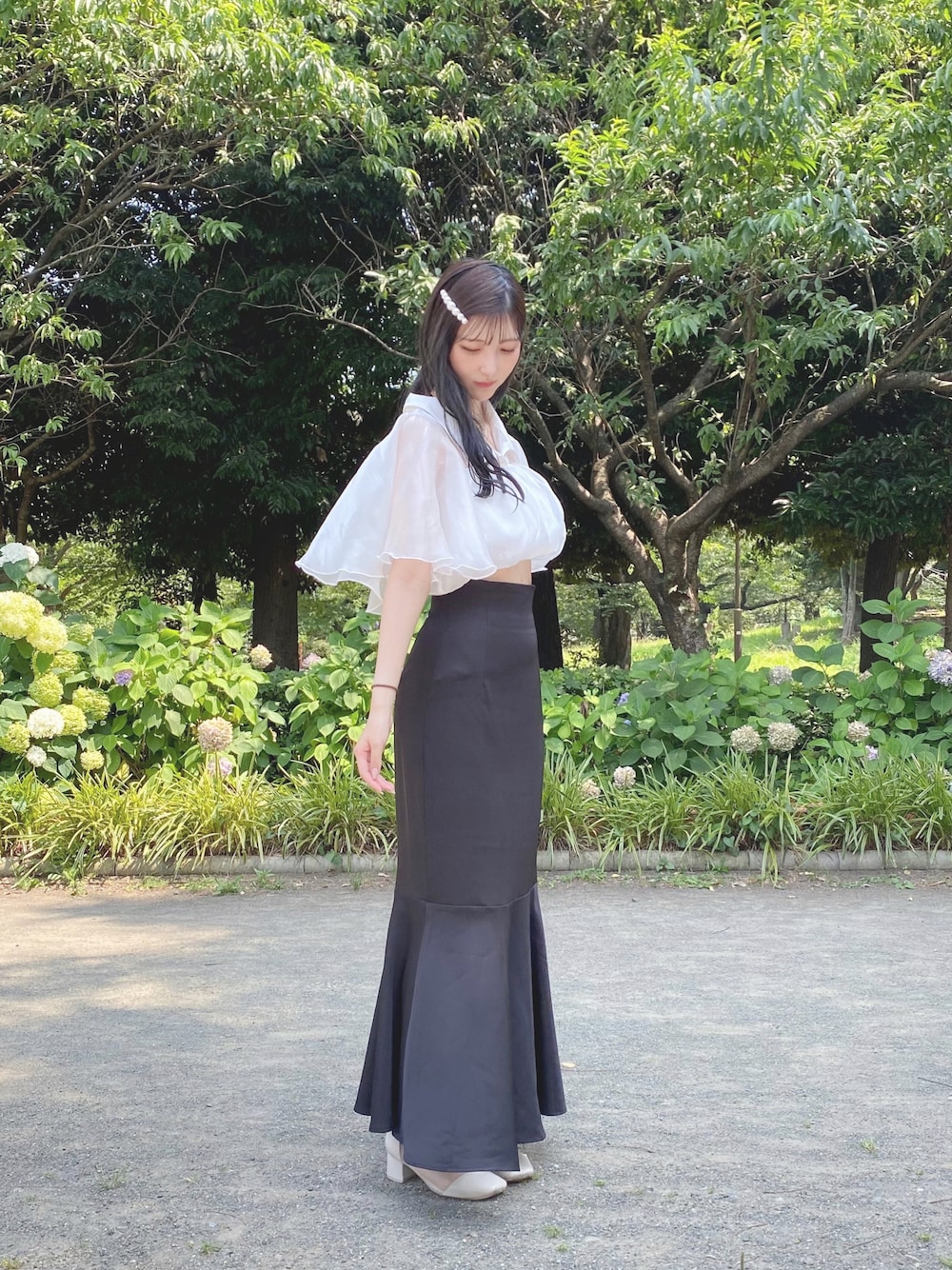 🌛のスカート「薄手ハイウエストフレアマーメイドスカート」を使ったコーディネート