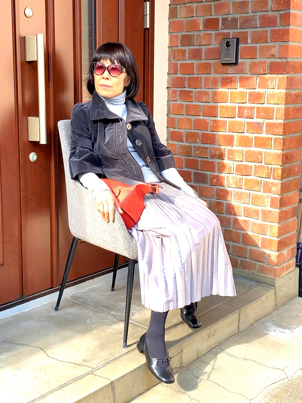 「日光浴」 Burberry Blue Label のベロアジャケットを活かすべく、ブラックではなくシルバーのスカートを合わせました。 よく晴れた暖かい天候もあって、だいぶ明るくなりました。 ブルーベースの私としては、ボソボソっとした素材はあまり合いにくいのですが、スカート、パンプス、ラメのタートルネックの光沢をMIXすることにより、バランスを取りました。 最初、カラータイツを黄色で合わせましたが、しっくりこなかったので、潔くブラックで。 バッグの赤も潔さ重視で、全体の引き立て役に。