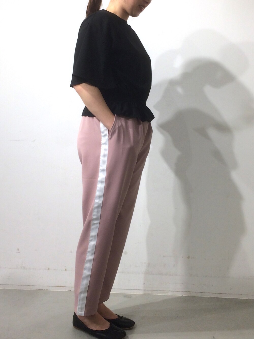 今日は黒×ピンクの組み合わせ👆 短めな丈のブラウス✨ ウエストにゴムが入っているので足長効果🙄に👯♂️ そして昨年から引き続きトレンドのラインパンツ🐥 スニーカー👟との相性も◎