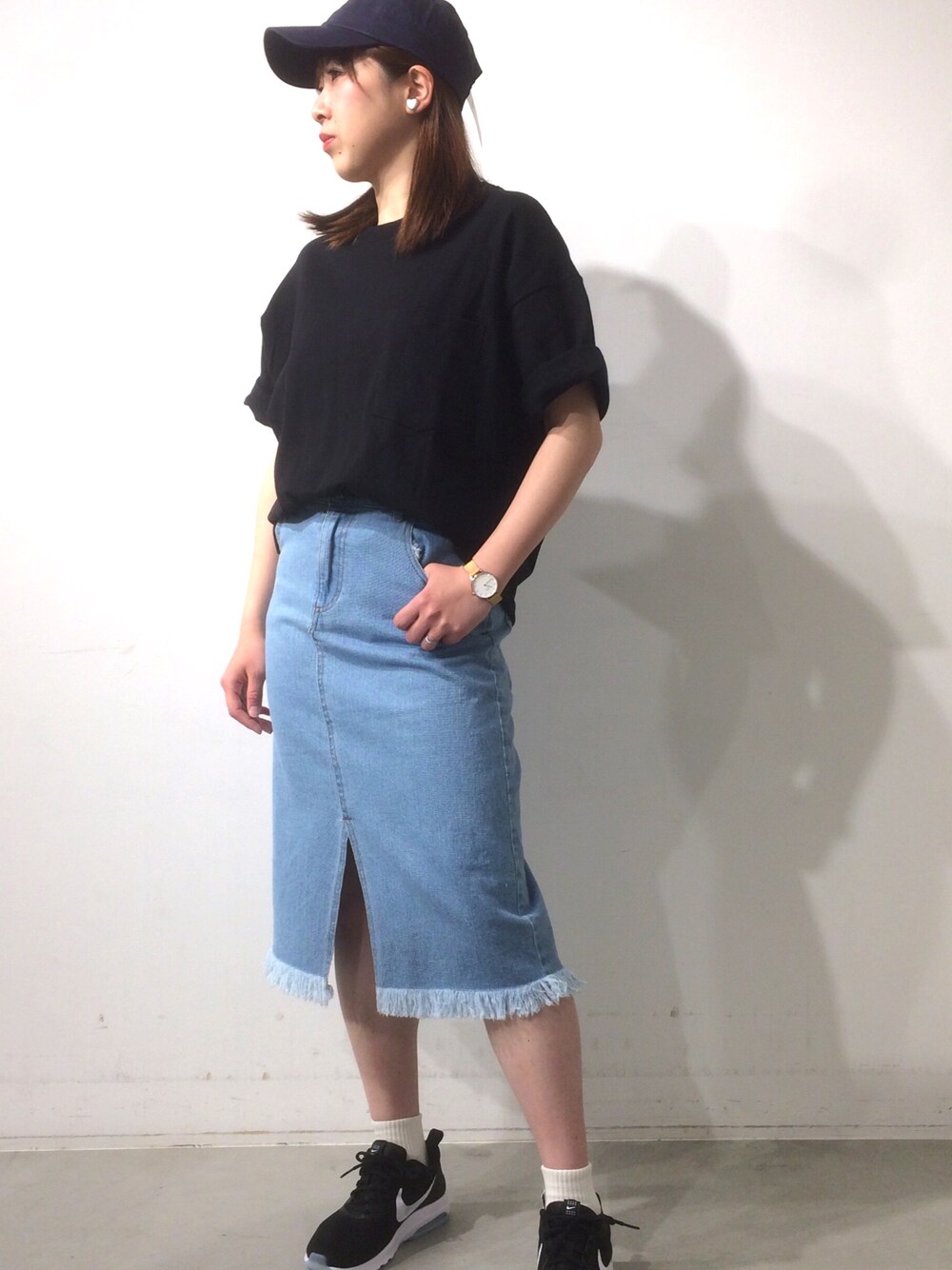 メンズTシャツにメンズのNIKEスニーカー🏃♀️ Tシャツは少しロールアップして肌見せ部分を多くすると◎ メンズのスニーカーなのですが違和感なし😂 スカート以外は暗色で統一して締まり感を出してみました👯♂️