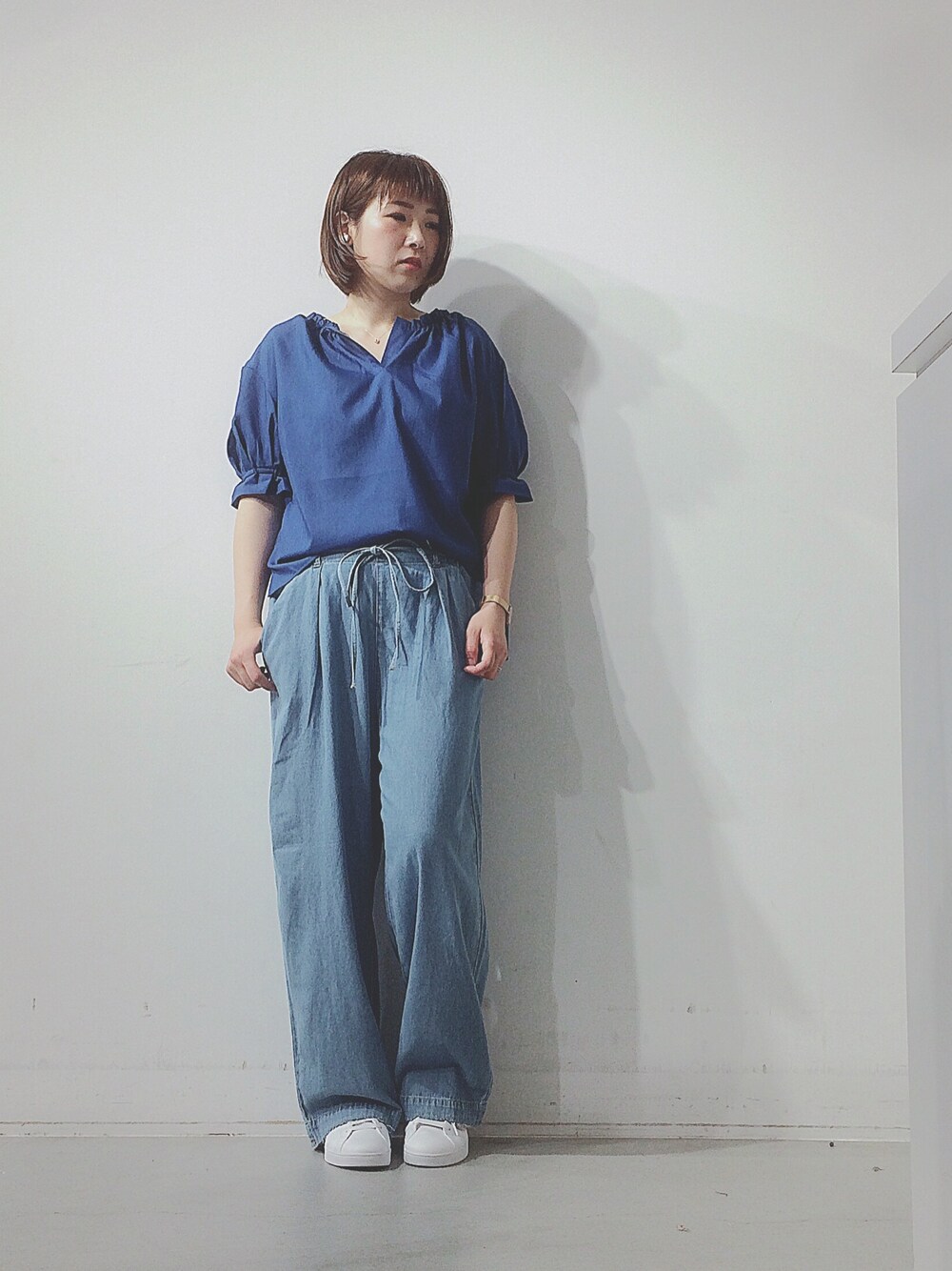 この前投稿したデニムを着回し〜👯♂️ トップスもブルーにして涼しげ🎐夏コーデにしてみました🕺 このお色、とっても人気があります🐥 トップスに色を持ってくるのを少し派手かな?と心配な方でも大丈夫🙆 深みのあるブルー🦋なので落ち着いて見えます◎ ボトムをリネンに変えるとますます旬なコーデになりますね💓