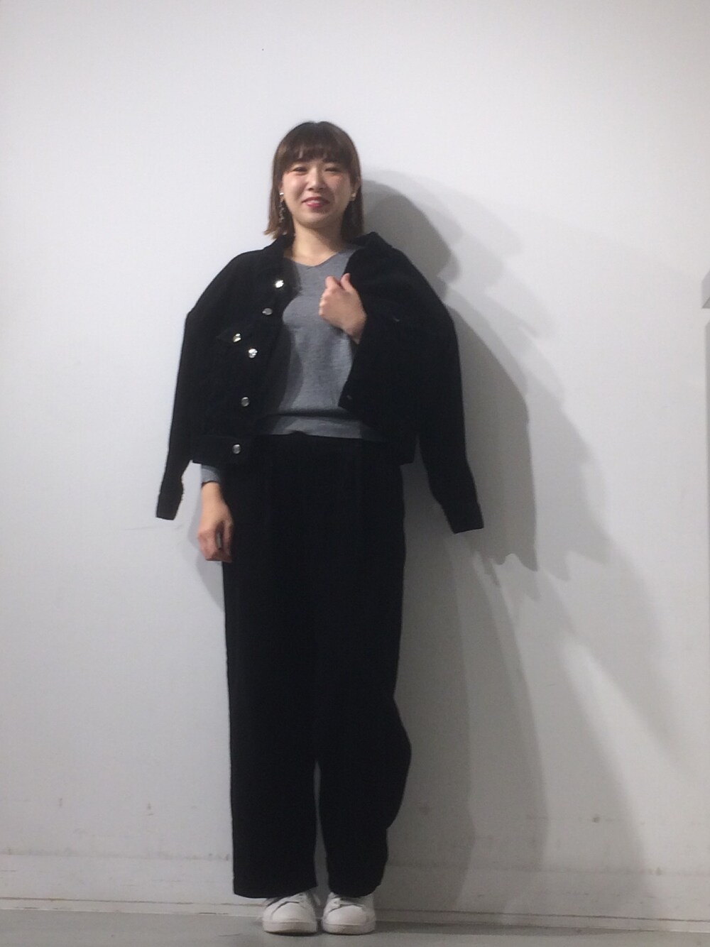 ジャケットが必要な気温になってきましたね🍃😖 上下黒のコーデュロイ、中はグレーのドルマンニットでモノトーンコーデ🐼 ニヤニヤした顔になってしまった🤤