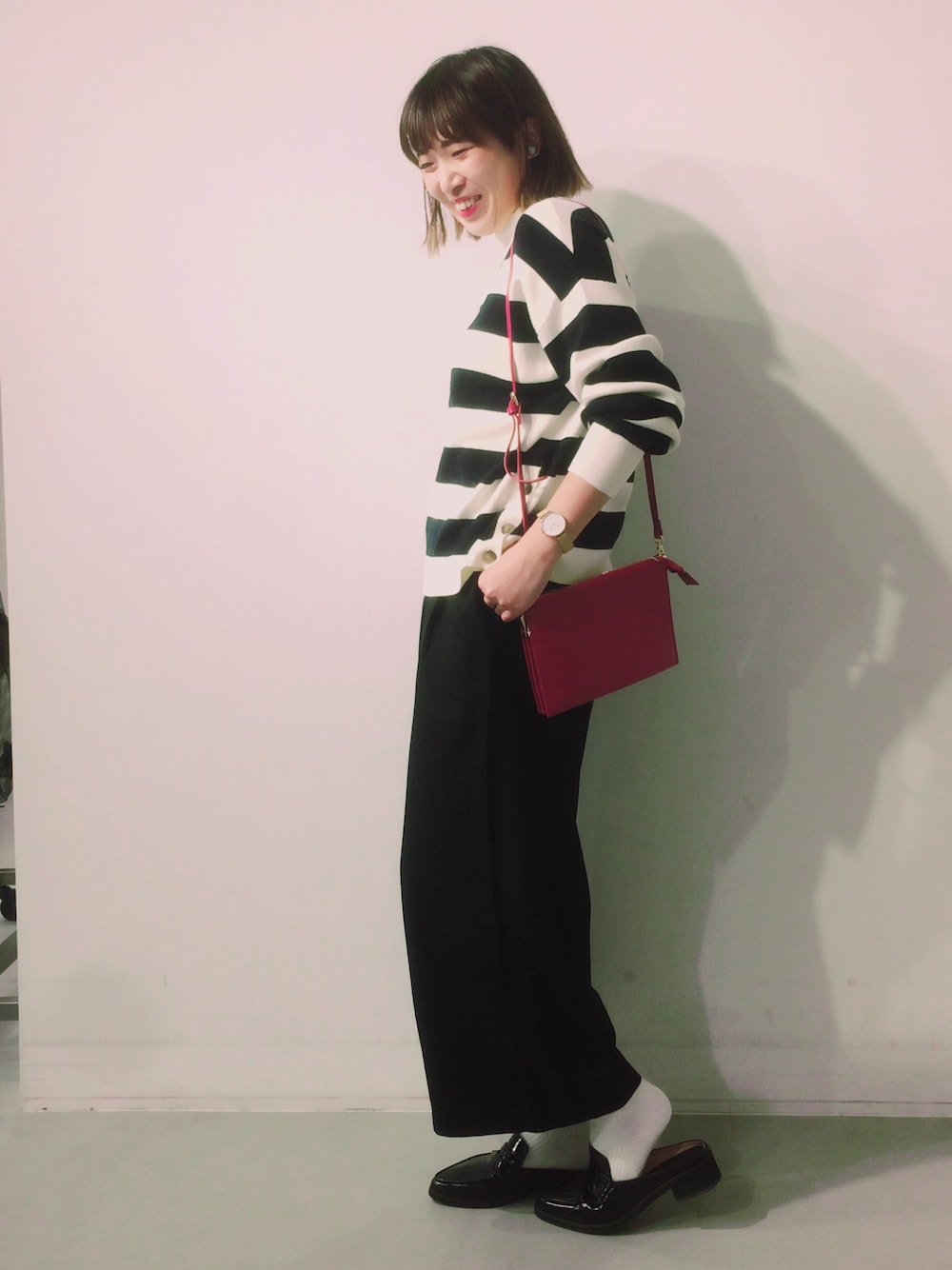 サイドのボタンが特徴あるニット👚 袖がキュッとなっているので少し捲るとメリハリつきます👀 ミニショルダーを赤にして差し色に🍁