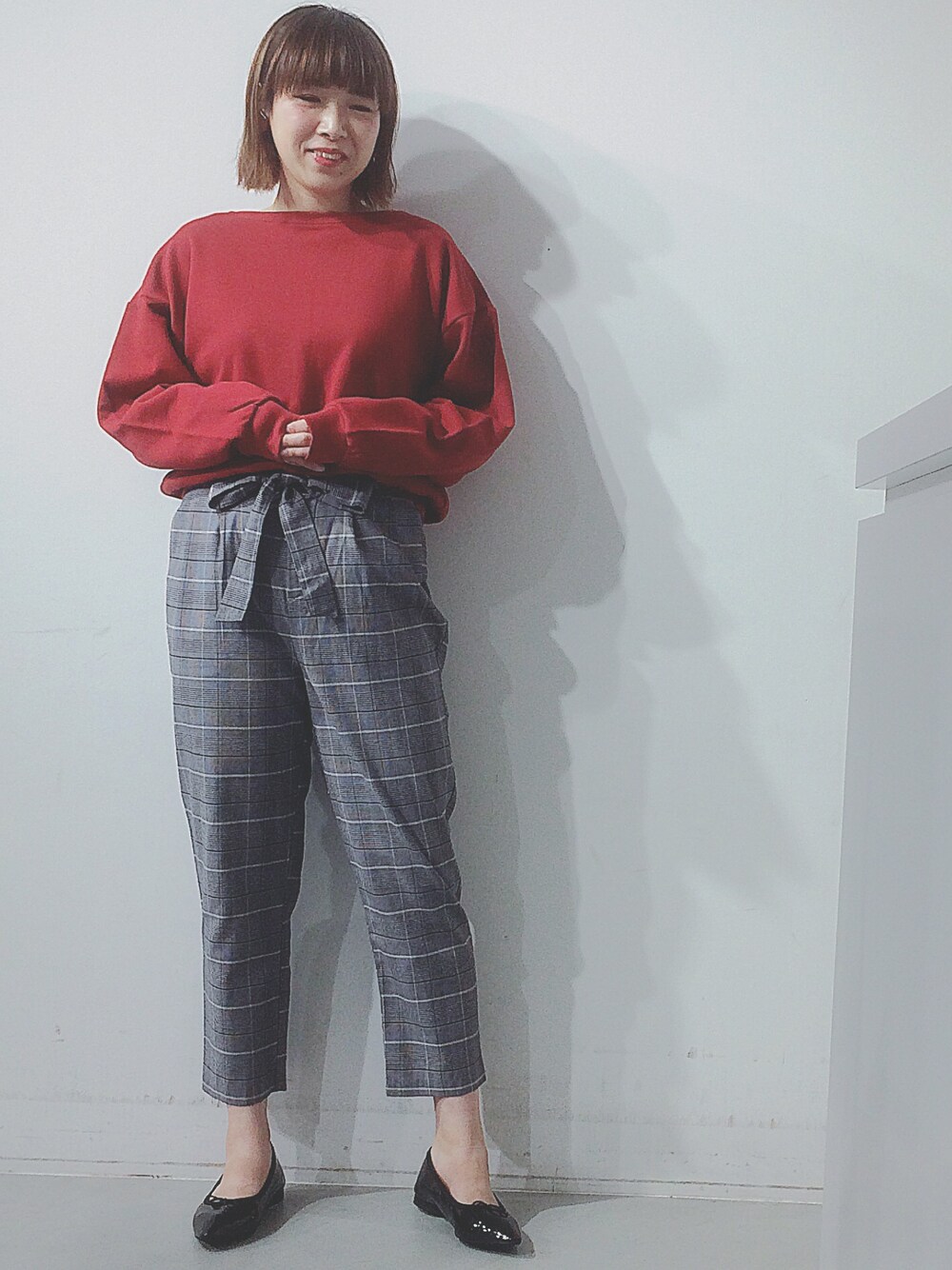 スウェットをテーパードパンツ、パンプスと合わせてきれいめに◎ 赤×チェックの組み合わせが好きすぎる😇🙏