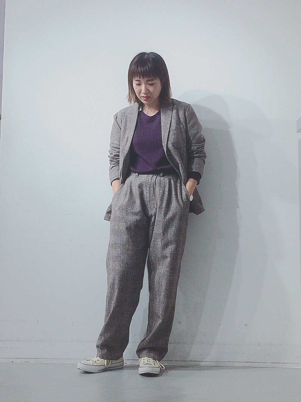メンズのジャケット、パンツのセットアップ😎 Vネックニットで女性らしさも💃 深い色のパープルで全体を落ち着かせたのもポイントです〜◎