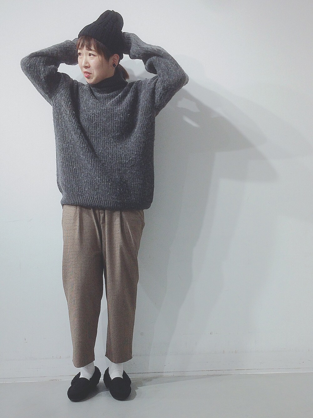 なかなかニット帽が上手く被れず、、なショット😂📸 変顔も晒していくスタイル😎 足元をモカシンにしたのがポイントです💃 もこもこあったか☺️💭