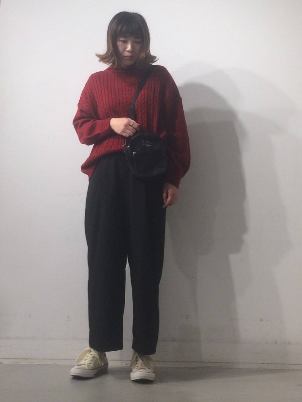 ゆったりした赤のケーブルニット💃 二の腕も気になりません🤭✨ ワイドでも細身のパンツでも着まわせる優秀な子です👏😲