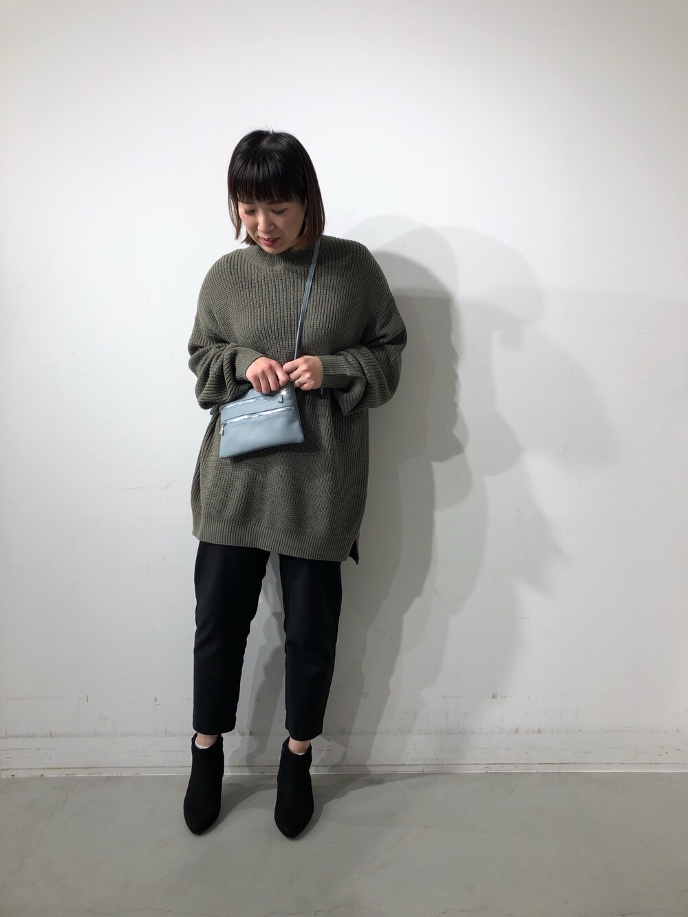 グレー黒の中にサックスブルーのサコッシュでワンポイント😊🎀 メンズのニットですが女性の方もゆるっと着ていただけます〜☺️💭