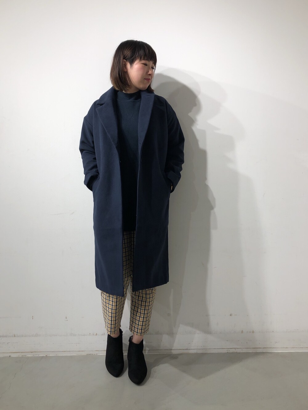 イエローとネイビーでツートーンコーデ💃 目立つ柄でも色を統一しちゃえば大人っぽく🤭その柄がいい味を出してくれます🥺🎀 裏地がついているパンツなので履き心地も◎ 中に着たのはメンズのニット😎 コートを脱げばオーバーサイズなシルエットで脚の細見せ効果🥰🐾