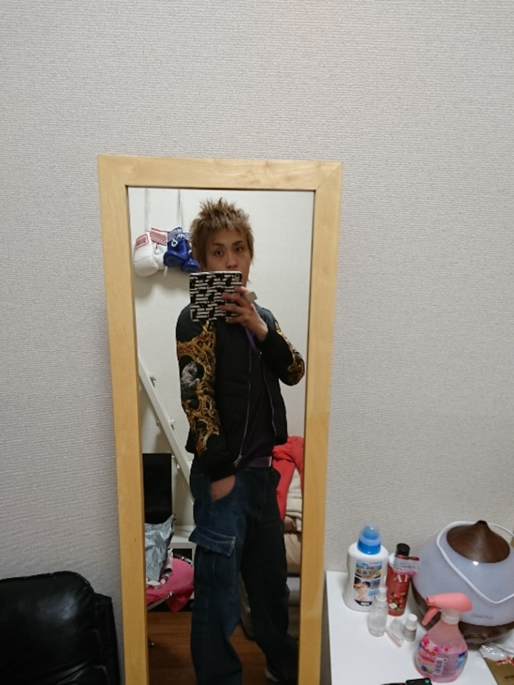 久しぶりですスミマセン(>_<) ダウンわライダースみたいに見えるインパクトあるやつだよー(*^^*) インナーわヒートテックでブラックxパープルのボーダー柄です!デニムわカーゴブッシュデニム!小物持ち歩く時便利だねポッケいっぱい😂