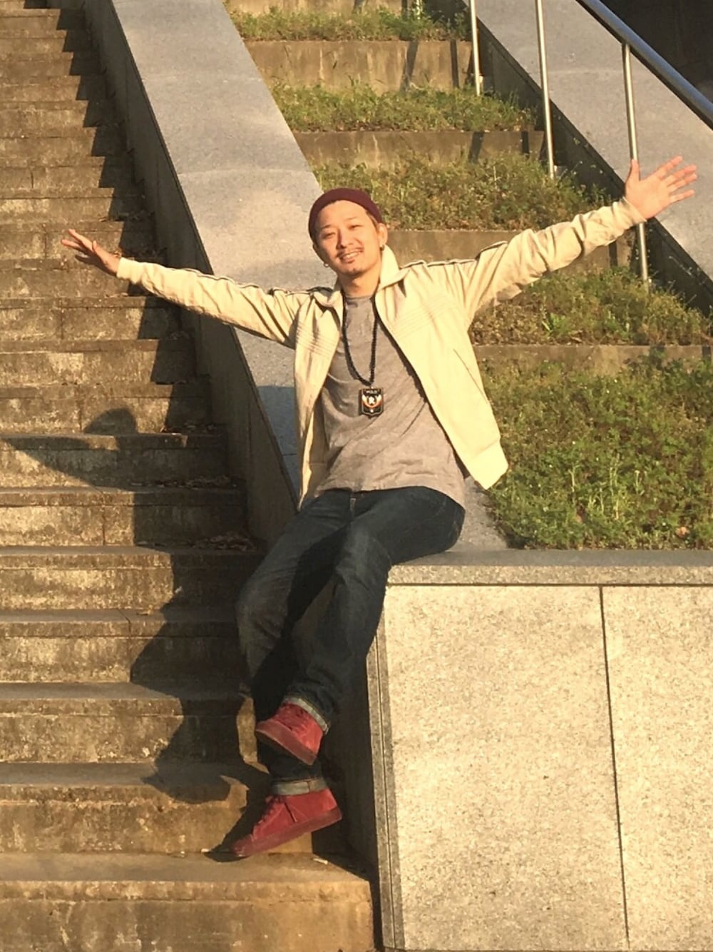 レッド系のスニーカーを着用したメンズの春コーディネートの1枚目の写真