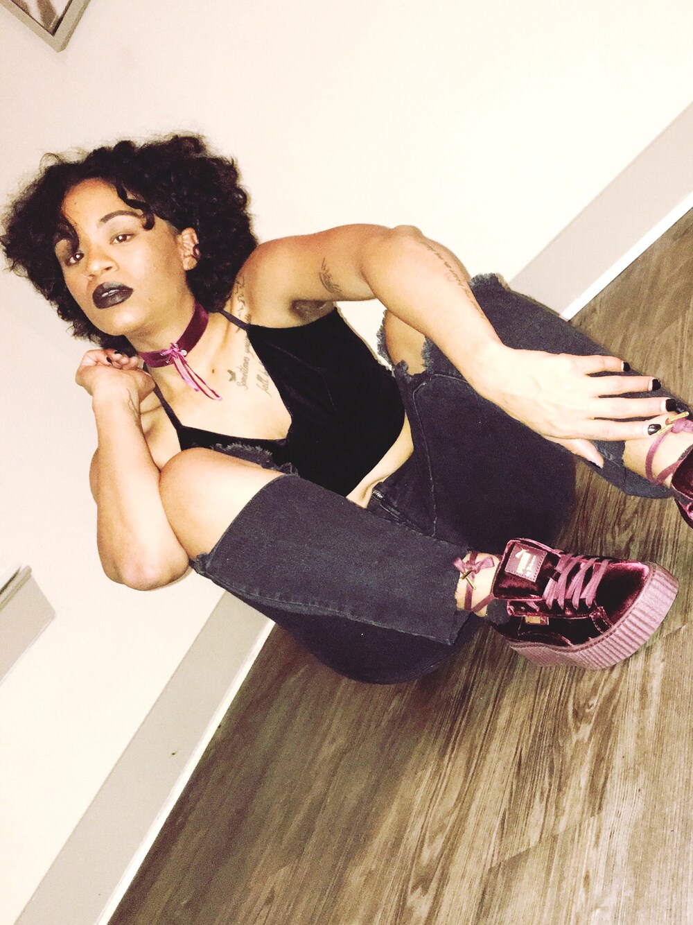 Simple all black look with burgundy shoes and necklace!